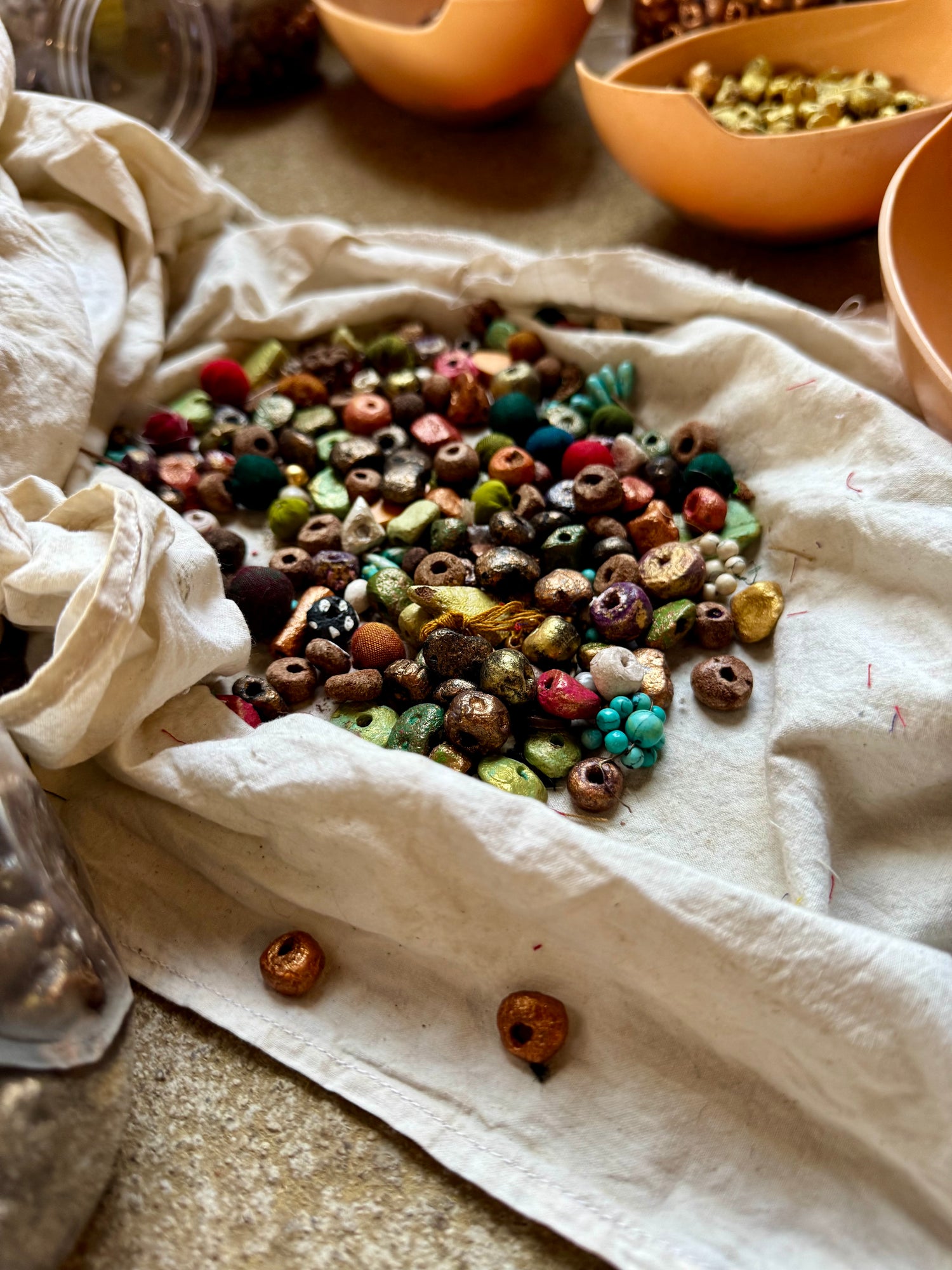 Our whimsical beads are moulded out of tamarind seeds that have been ground to a paste and dried. Inspired from a traditional art form this was our take on eco friendly embellishments. Completely natural and handmade, we paint them in brilliant colours to make you look fabulous.